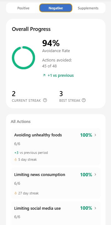 - you add bad habits to the Longevity Protocols app, and the app rewards you with statistics and notifications for each day you manage to avoid them.