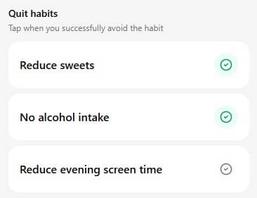 You mark them as completed when you do them. The app tracks your consistency over time, and these habits positively impact your health assets (Physical, Cognitive, Emotional).