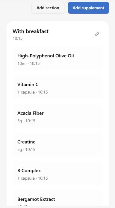 Time sections: Supplements are automatically grouped by time of day: With Breakfast, With Lunch, With Dinner, Before Bed, Anytime. You can also create your own custom time sections.