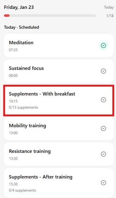 - Today — Scheduled — All habits, supplements, and workouts scheduled for specific times, sorted chronologically