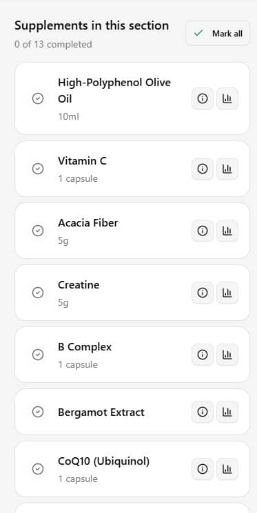 In your daily checklist, supplements appear in their corresponding time sections. Just tap a supplement to mark it as taken. The app automatically tracks your adherence for each supplement, shows stats per supplement, and can remind you to take them (if notifications are enabled).