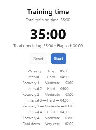 Norwegian 4×4 is an interval protocol that consists of 4 minutes of high-intensity work, 3 minutes of easy recovery, repeated 4 times (35 minutes total).