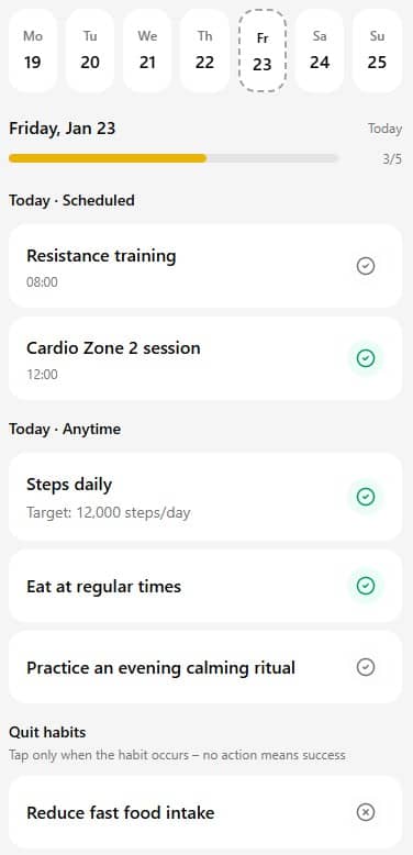 This is the central place in the app where you see all of your day-to-day health-related actions. Think of it as your personal control panel — it shows you exactly what you should do on a given day.