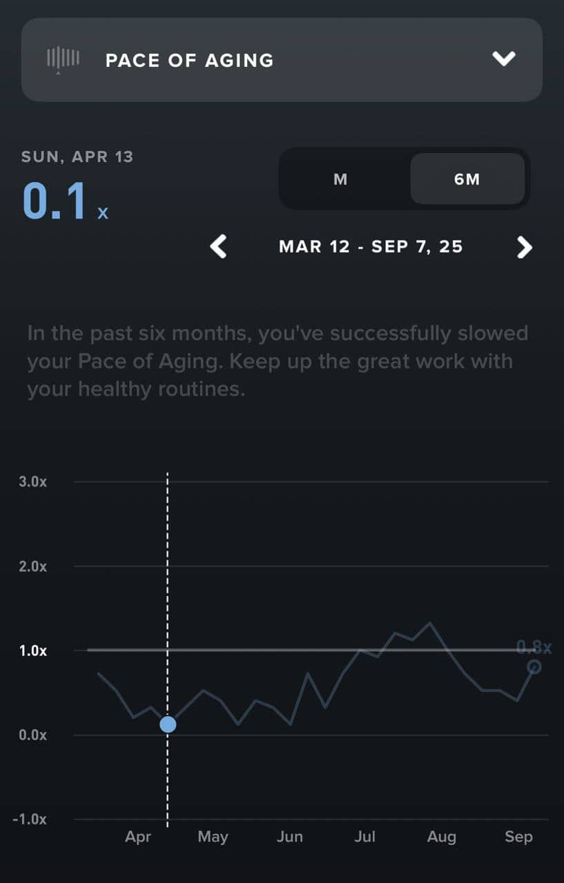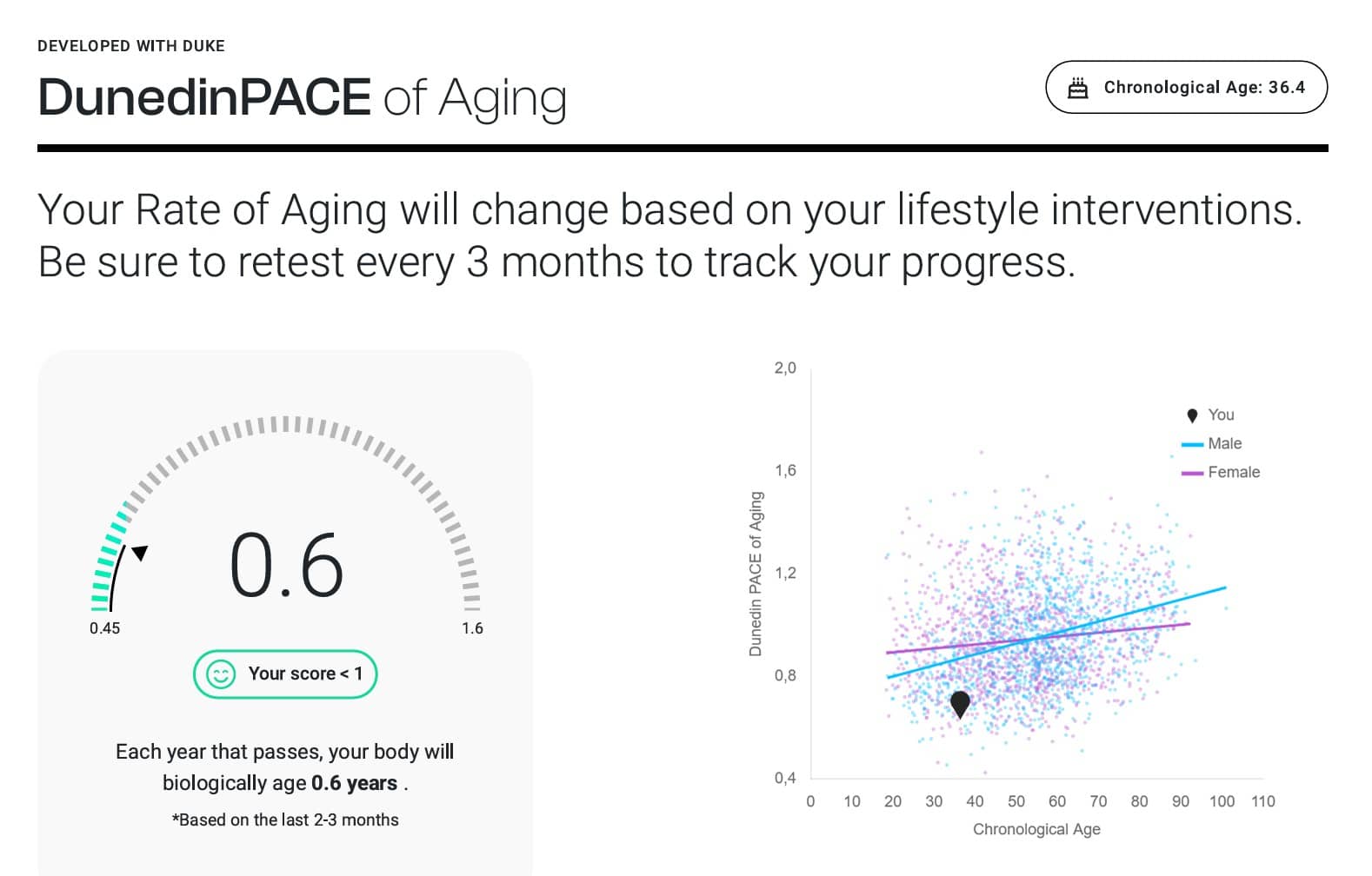 My DunedinPACE is currently 0.6 — this means that for each calendar year, my body ages by only 0.6 years (about 7 months per year).