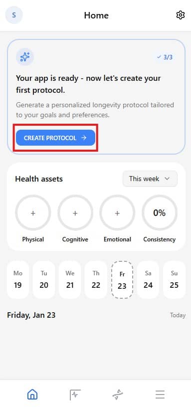 Kliknij przycisk "CREATE PROTOCOL" aby uruchomić inteligentny kreator, który krok po kroku poprowadzi Cię przez proces tworzenia Twojego pierwszego protokołu długowieczności.