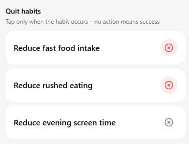 - Nawyki do ograniczenia (Quit Habits) — Specjalna sekcja dla nawyków, które chcesz ograniczyć lub wyeliminować