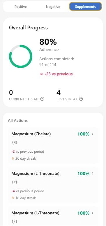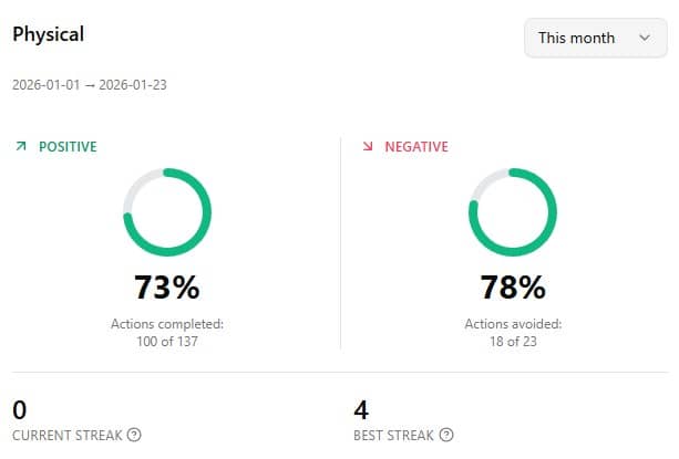 Statystyki i analityka: Szczegółowe statystyki dla każdego nawyku, suplementu i treningu; heatmapy aktywności pokazujące Twoją konsekwencję dzień po dniu; trendy w czasie dla wszystkich działań; analiza według dni tygodnia — zobacz, w które dni jesteś najbardziej konsekwentny; porównania okresów — porównaj swój postęp między różnymi okresami.
