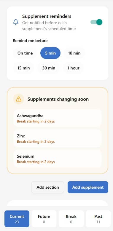 Sekcje czasowe: Suplementy są automatycznie organizowane w sekcje według pory dnia: Z śniadaniem, Z obiadem, Z kolacją, Przed snem, O dowolnej porze. Możesz również tworzyć własne sekcje czasowe.