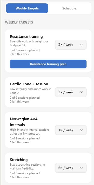 Typy aktywności: Możesz ustawić tygodniowe cele dla: Treningu siłowego (Resistance Training), Cardio Zone 2, Interwałów norweskich 4×4 (Norwegian 4×4 Intervals), Rozciągania (Stretching), Mobilności (Mobility Training), Równowagi (Balance Training).