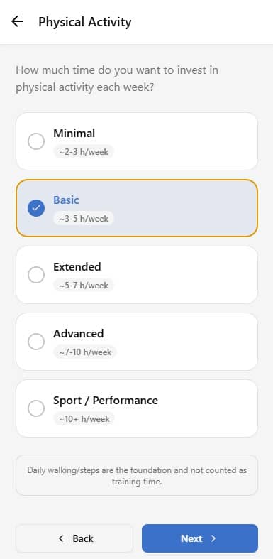 - Poziom zaangażowania — Określ, ile czasu tygodniowo chcesz poświęcić na aktywność fizyczną (od Minimalnego 2-3h/tydzień do Sportowego/Wydajnościowego 10+h/tydzień)