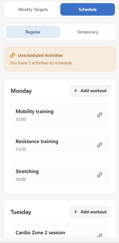 Harmonogram (Schedule): W zakładce "Schedule" możesz przypisać konkretne treningi do konkretnych dni i godzin. Wybierz typ aktywności, dzień tygodnia, ustaw godzinę (lub zostaw "All day" dla aktywności bez konkretnej pory). Trening pojawi się w Daily Checklist w zaplanowanym dniu i czasie.