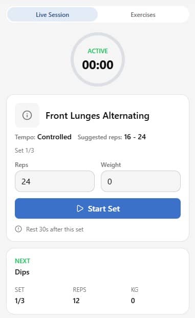 Sesja treningowa na żywo: Gdy nadejdzie czas na trening, kliknij na zaplanowany trening w Daily Checklist, wybierz "Start Workout". Aplikacja otworzy sesję treningową na żywo, gdzie możesz śledzić każdą serię, powtórzenie i obciążenie, używać timera odpoczynku między seriami, zapisywać notatki do każdego ćwiczenia, dostosowywać obciążenie w trakcie treningu oraz oznaczać ćwiczenia jako pominięte, jeśli nie możesz ich wykonać.