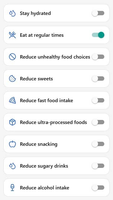 W następnych krokach kreator wyświetli Ci dodanie do swojego protokołu różnych nawyków i aktywności z kategorii takich jak dieta, sen czy zarządzanie stresem.