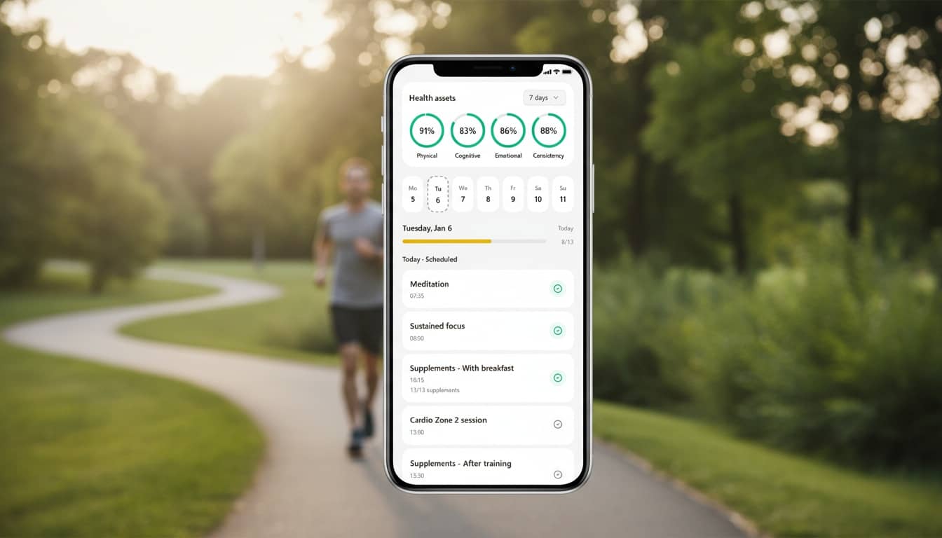 Aplikacja mobilna Longevity Protocols to narzędzie, które pozwoli Ci wdrożyć w życie wszystkie założenia tej strategii. To Twój osobisty system operacyjny dla zdrowia — miejsce, gdzie planujesz, śledzisz i optymalizujesz swoje inwestycje w długowieczność.