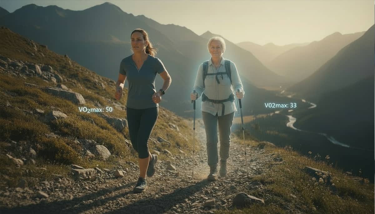Ale jeśli zamiast 40 utrzymasz VO₂max na poziomie 50 ml/kg/min w wieku 40 lat, to po 50 latach spadnie on do ok. 33 ml/kg/min — nadal wystarczająco, by z uśmiechem zdobywać górskie ścieżki.