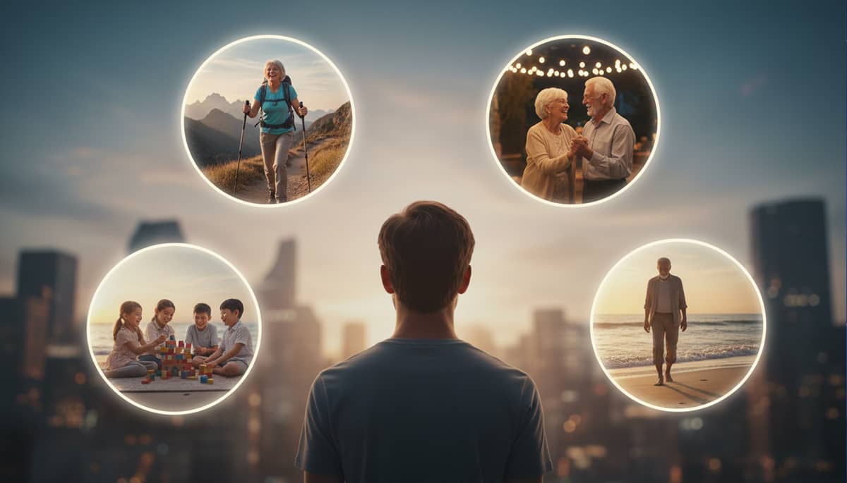 Wykorzystaj AI, by wygenerować realistyczne obrazy siebie w wieku 80 lat, gdy robisz to, o czym marzysz: idziesz po górskim szlaku, tańczysz z partnerką, grasz z wnukami w ogrodzie.