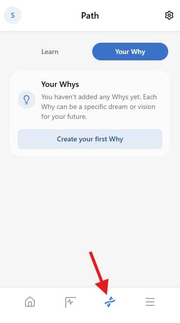 Aby dodać swoje "Dlaczego" w aplikacji kliknij najpierw w ikonę DNA, przełącz zakładkę na "Your Why" i kliknij przycisk "Create your first Why".