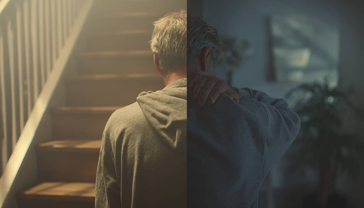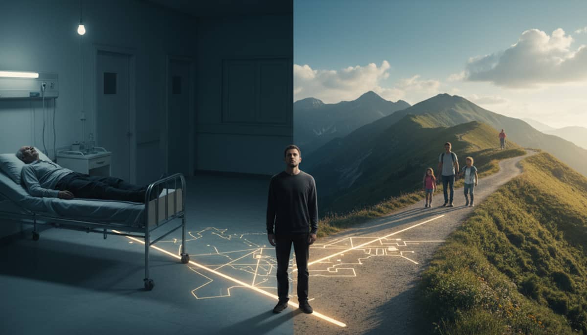 W pierwszej wersji leżysz w łóżku, unieruchomiony bólem, patrząc z dystansu na świat, który dzieje się bez Ciebie. W drugiej idziesz górskim szlakiem z bliskimi, pełen energii, sprawności i radości.